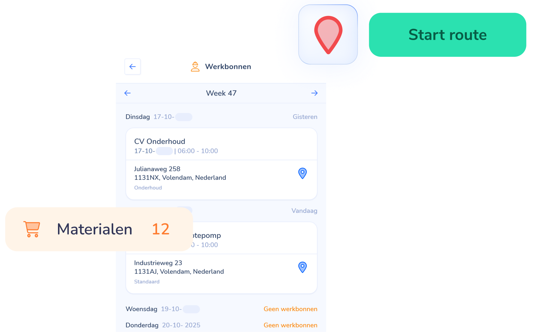 Plan niet alleen mensen, maar ook wat ze nodig hebben. Door materiaal aan afspraken te koppelen, weet je vooraf wat er mee moet en wat gereserveerd is. Dat scheelt last-minute geregel, extra ritten en vertraging op locatie.